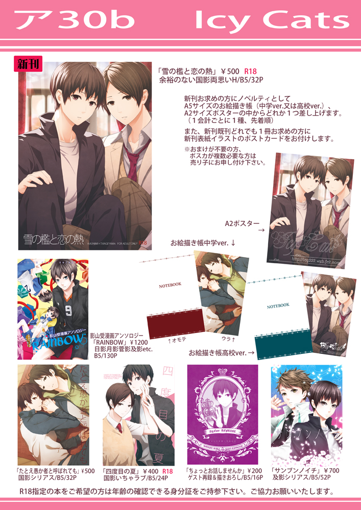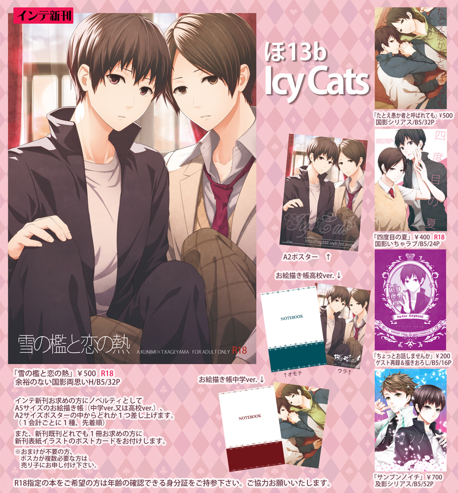 インテの新刊(「雪の檻と恋の熱」500円)お求めの方にA5サイズのお絵描き帳(中学バージョンか高校バージョンどちらか)もしくはA2サイズのポスターをお付け致します(1会計ごとに1種まで)。